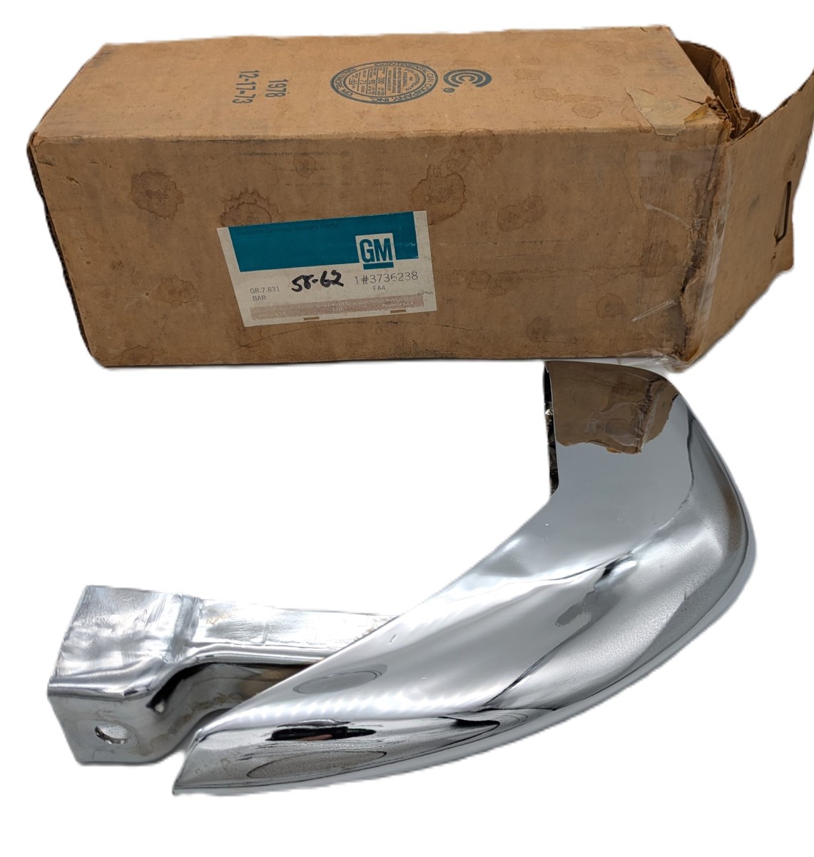 This is a NOS right hand Bumperette for 1958 through 1962 Corvettes. Never installed and still in the original GM box. It has been in our warehouse for many years but is still in good condition. It has some shelf wear and minor surfaces scratches in the chrome, which is visible in the pictures. Original GM part number 3736238.