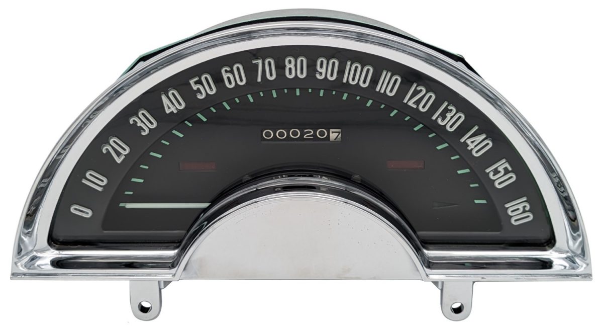 Restored original Speedometer for late 1960, 1961, & 1962 Corvettes. This unit is completely rebuilt in our shop inside and out, accurately calibrated, and is ready to install. It has been restored with a new lens, a freshly screened inner face, and our new reproduction chrome bezel. This version has pale green graphics on the face behind the lens. Note: Corvette Speedometers from 1959 to 1962 all used the same part number, but there were both white and pale green graphics used during that period. Transition to pale green began in 1960, and even some early 1961 Corvettes still had the white graphics. Original GM part #1586928.