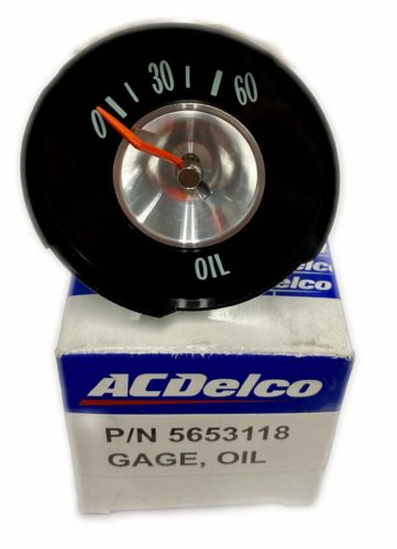 New reproduction 60 lb. Oil Gauge for 1963 Corvettes. This gauge is a direct replacement part manufactured under license by a major AC Delco supplier. Gauge reads 0-30-60 and has extremely accurate movement. Font and coloring is just like the originals. Part# 5653118.
