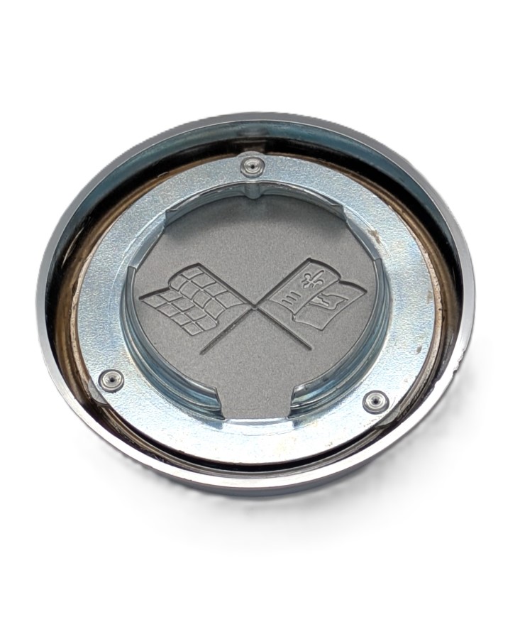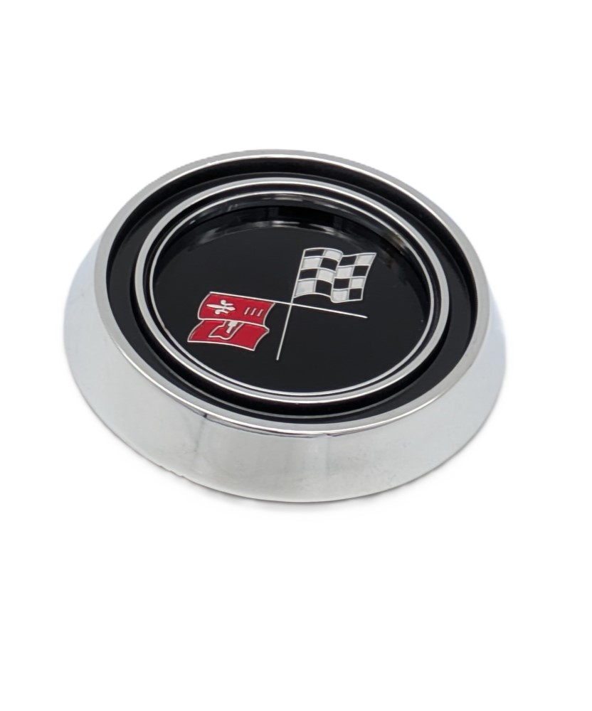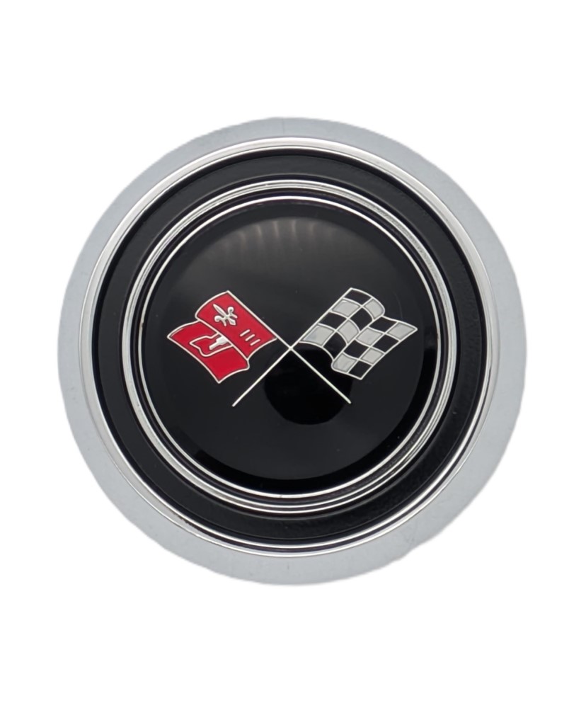 This is a new, reproduction standard horn button for 1965 and 1966 Corvettes with the standard, non telescopic steering column The horn button is fully assembled with emblem and ready to install, just press the button into the stand. Fits standard columns only. Riveted back. Licensed GM Restoration Part made by a licensed GM supplier.