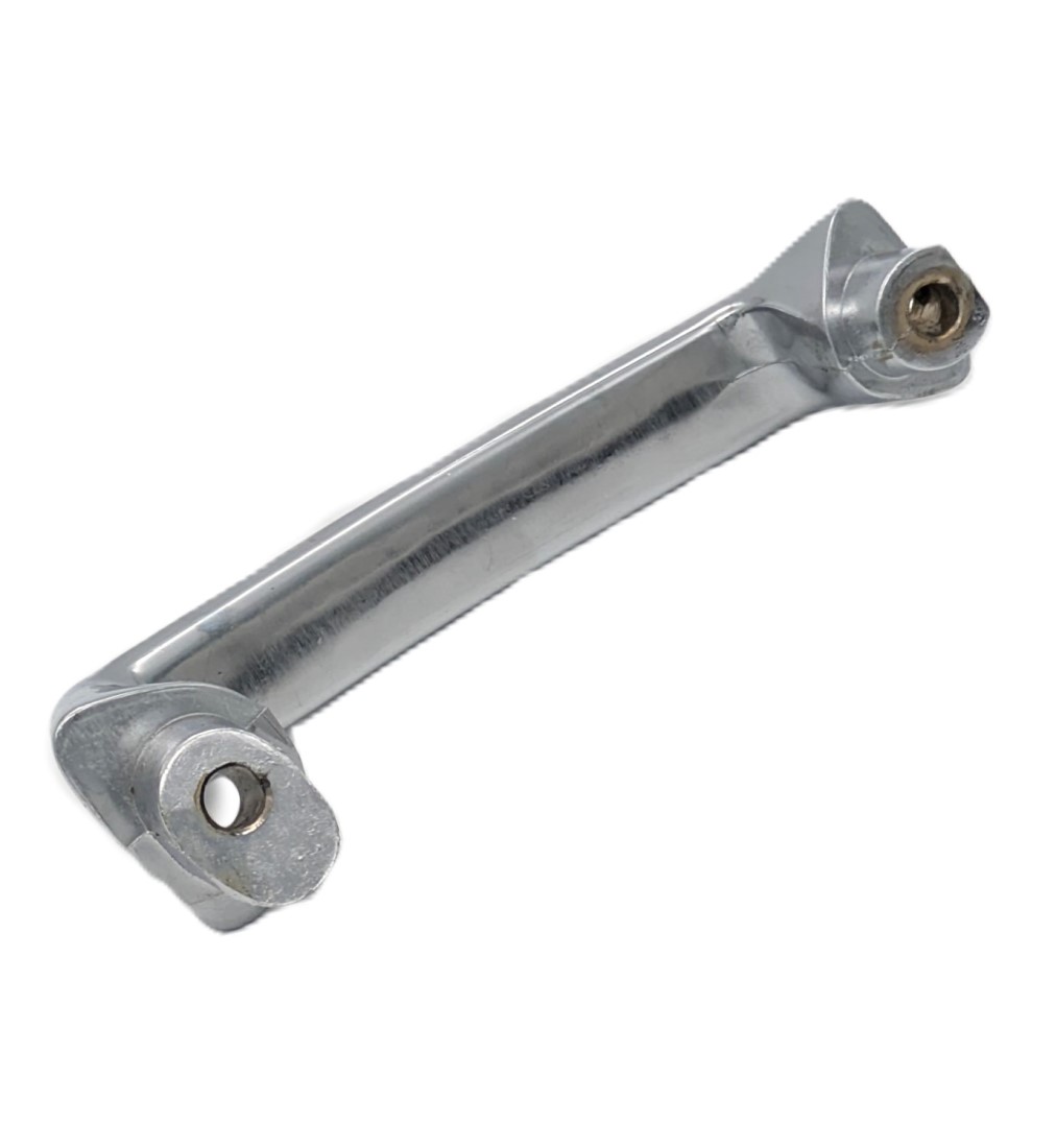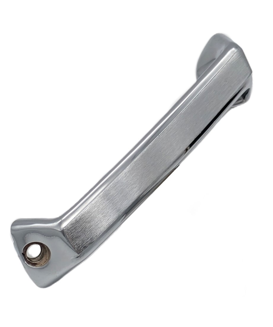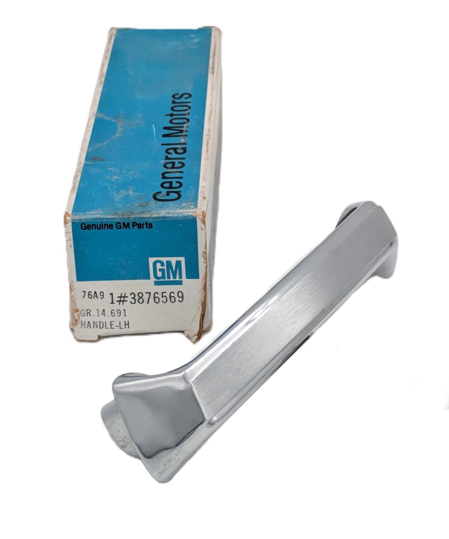 This is a NOS Left Side Inner Door Pull Handle for 1966 and 1967 Corvettes. Brushed chrome finish along the outer edge. It is a Genuine GM new old stock part in excellent condition. The handle has never been installed and is still in the original GM box. Original GM part number 3876569.
