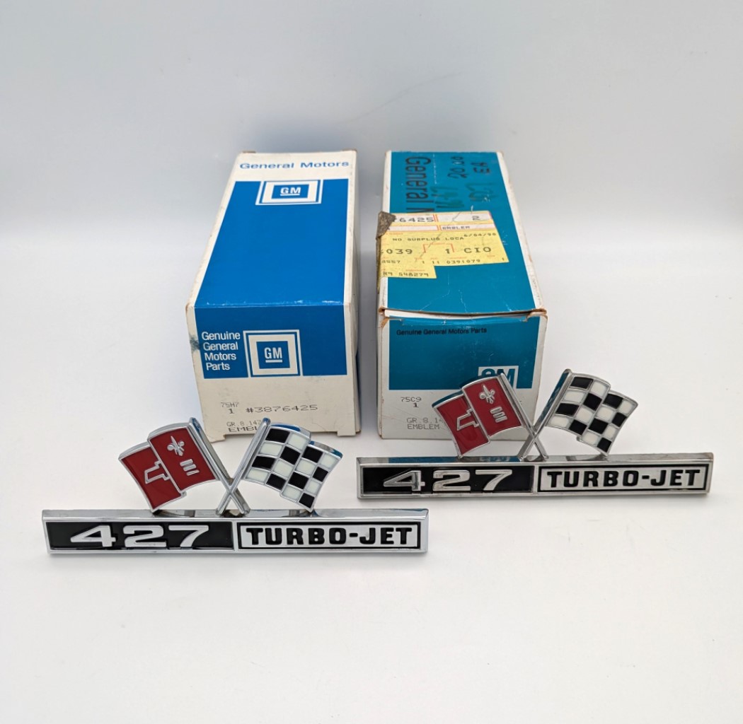 Pair of NOS “427 Turbo-Jet” Emblems for 1966 Corvette only. These are genuine GM new old stock emblems still in their original GM boxes. They are in excellent condition and have never been installed. Little to no shelf wear (see images)! Original GM part number 3876425.
