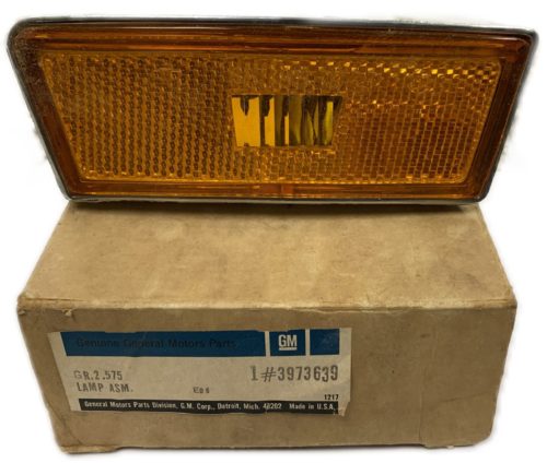 This is a NOS 1970-1972 Corvette Left Front Side Marker Lamp. This lamp is brand new and still in its original GM part box. Never installed. It has an amber colored lens with the Chevrolet logo and “SAE API 70 LF” markings. Rear has two post mounts and lens opening. Original GM part number 3973639.