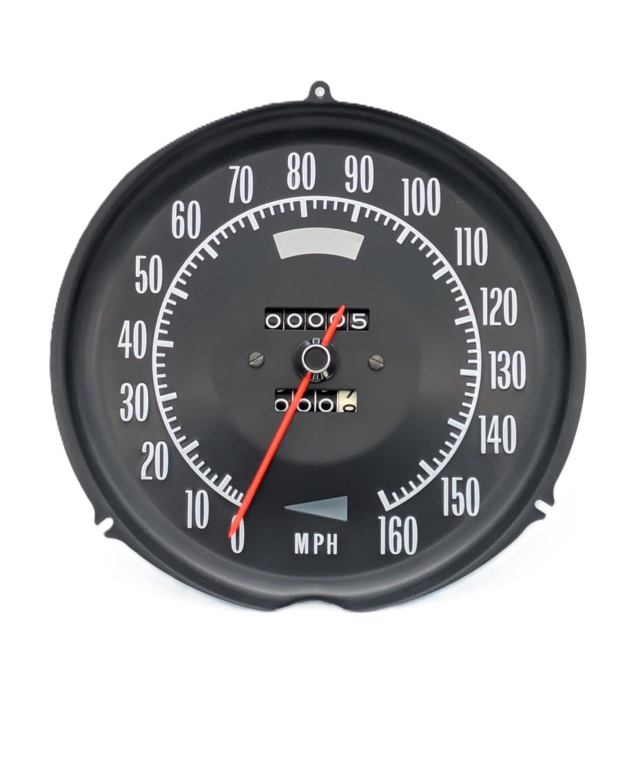 Brand new Speedometer Assembly for 1972 through 1974 Corvettes. Uses a push on cable. Unlike the less expensive alternative being sold, this unit is assembled with original AC Speedometer parts. No plastic pointers and no parts that cannot be serviced at a later date should the need arise. No trade in required. Please note, supply is limited. Original GM part number 6496850.