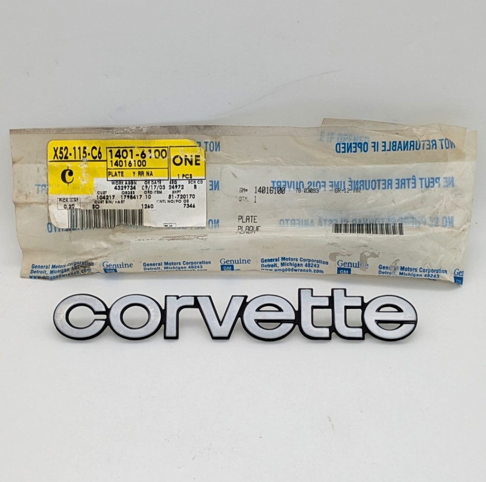 This is a NOS Rear Emblem Script for 1980 through 1982 Corvettes. It is in excellent condition and is still in the original GM packaging. If your original emblem script is damaged, missing, or starting to pit, this is an excellent replacement! Original GM part number 14016100.