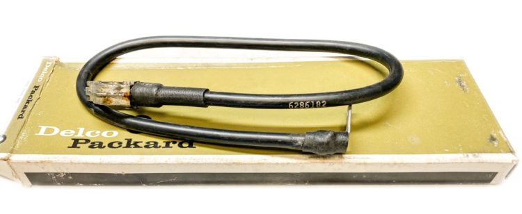New Old Stock (NOS) in the box Positive Battery Cable for 1966 & 1967 big block Corvettes. Please note: the cable is only correct for non air-conditioned cars with the battery on the passenger side. Purchased from a Chevrolet dealer in the 1970’s and just found in our inventory, this GM part number 6286182 Spring Ring Cable was serviced in the GM parts system until November 1970. It was replaced at that time with a cable that would work, but was not correct. The part number stamping is as clear as the day it was manufactured. We have never seen another NOS cable like this!