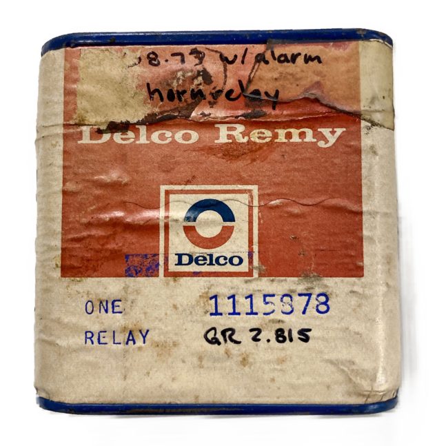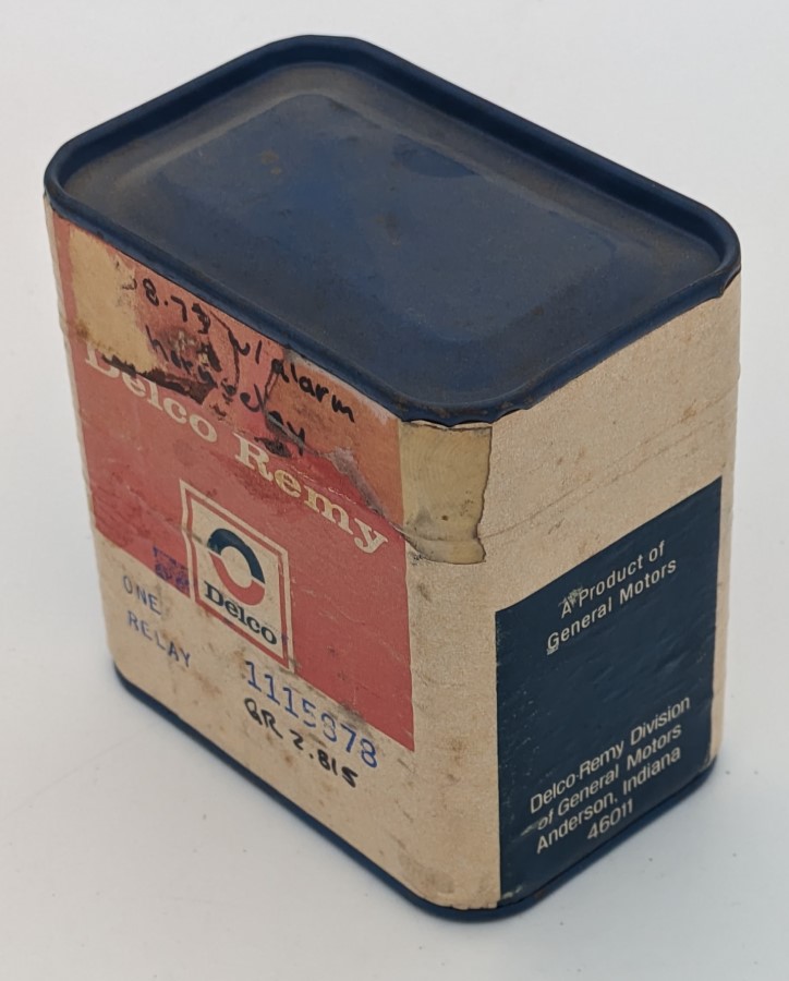 NOS Anti Theft Relay for 1968 through 1977 Corvettes. Used to control the alarm horn. This relay is in the original Delco Remy pull string box and has never been opened!